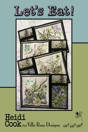 Discover the charm of this exquisite quilt pattern, perfect for both home decor and as a thoughtful gift. Measuring 12in x 18in, this quilt features a delightful theme centered around the joy of dining with the playful title 'Let's Eat!' The design is adorned with intricate illustrations of nature, including butterflies, ferns, and dragonflies, all set against a soft, marble-like background. This quilt pattern, designed by Heidi Cook for Villa Rosa Designs, brings a touch of whimsical elegance to any space, making it a standout piece for any quilting enthusiast or home decorator.