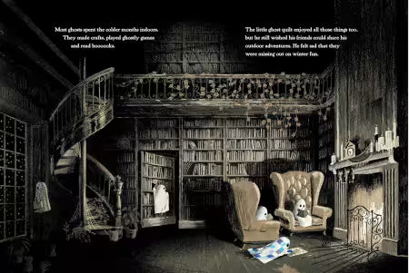 When you're a quilt instead of a sheet, being a ghost is hard! But it does mean you can float around in cold weather . . . an adorable picture book about a ghost who wants to share the magic of the season with his chilly sheet friends. The little ghost quilt loves being out in the cold. For once, he doesn't overheat, and he likes how the snowflakes make his patches look polka-dotted. His friends, who are sheets, get too cold in the winter weather and have to stay inside, but the little ghost quilt doesn't mind. He enjoys slowly drifting along on his own. On one of his frosty flights, he sees something happening in the town. People are putting up warm, twinkling lights, and there's a fun festive feeling everywhere — like Halloween, his favorite season, but with snowmen and wreaths and candles in windows instead of pumpkins. He is filled with excitement and happiness looking at all the beautiful decorations and joyous people, yet he can't help but feel sad that his friends can't be there. But then, after almost getting caught in a blizzard, the little ghost quilt is struck by inspiration